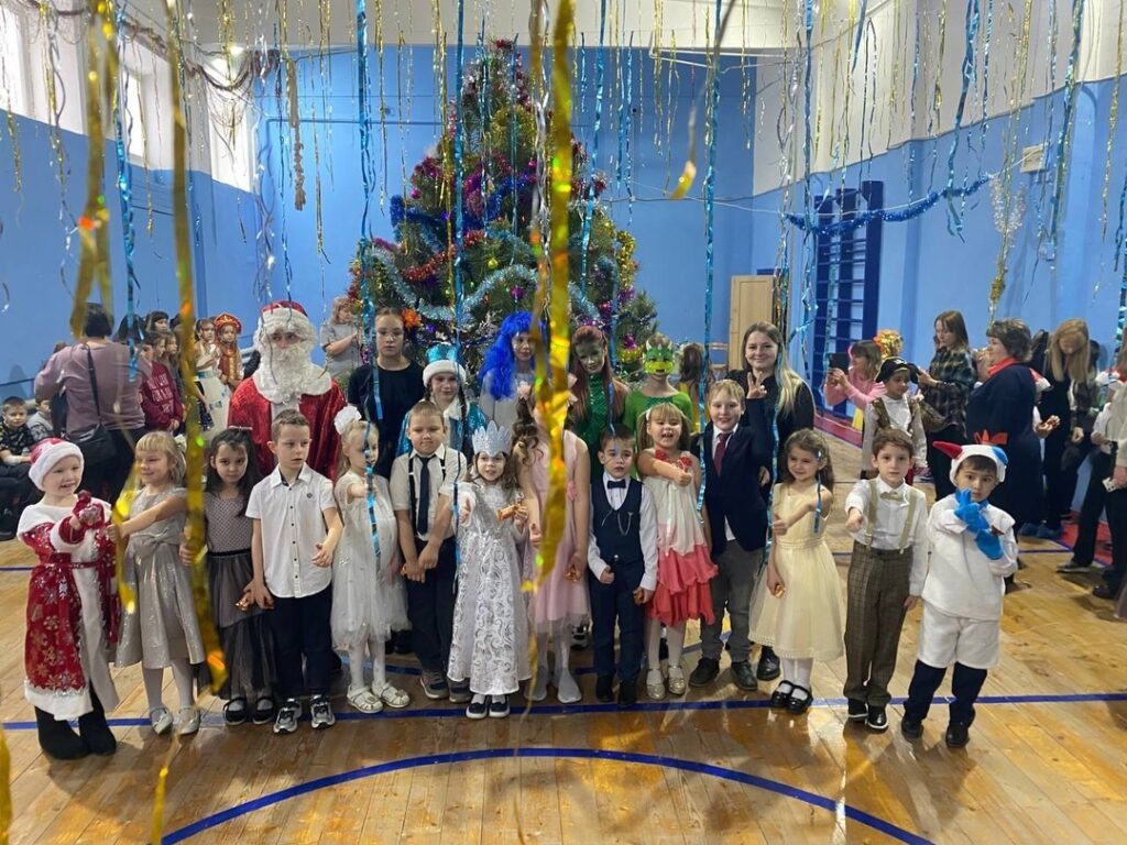 Ребята пришли на елку, нарядившись в карнавальные костюмы. Ребятишки расхаживали в нарядах принцесс, ковбоев, бэтменов и других сказочных героев. В спортивном зале их ждала огромная новогодняя елка, а развлекали детей сказочные персонажи, из школьного театра «Карабас Барабас», : Дед Мороз, Снегурочка, старуха Вредьма, Клава, Дракошка и символ 2025 года — Змеюшка.